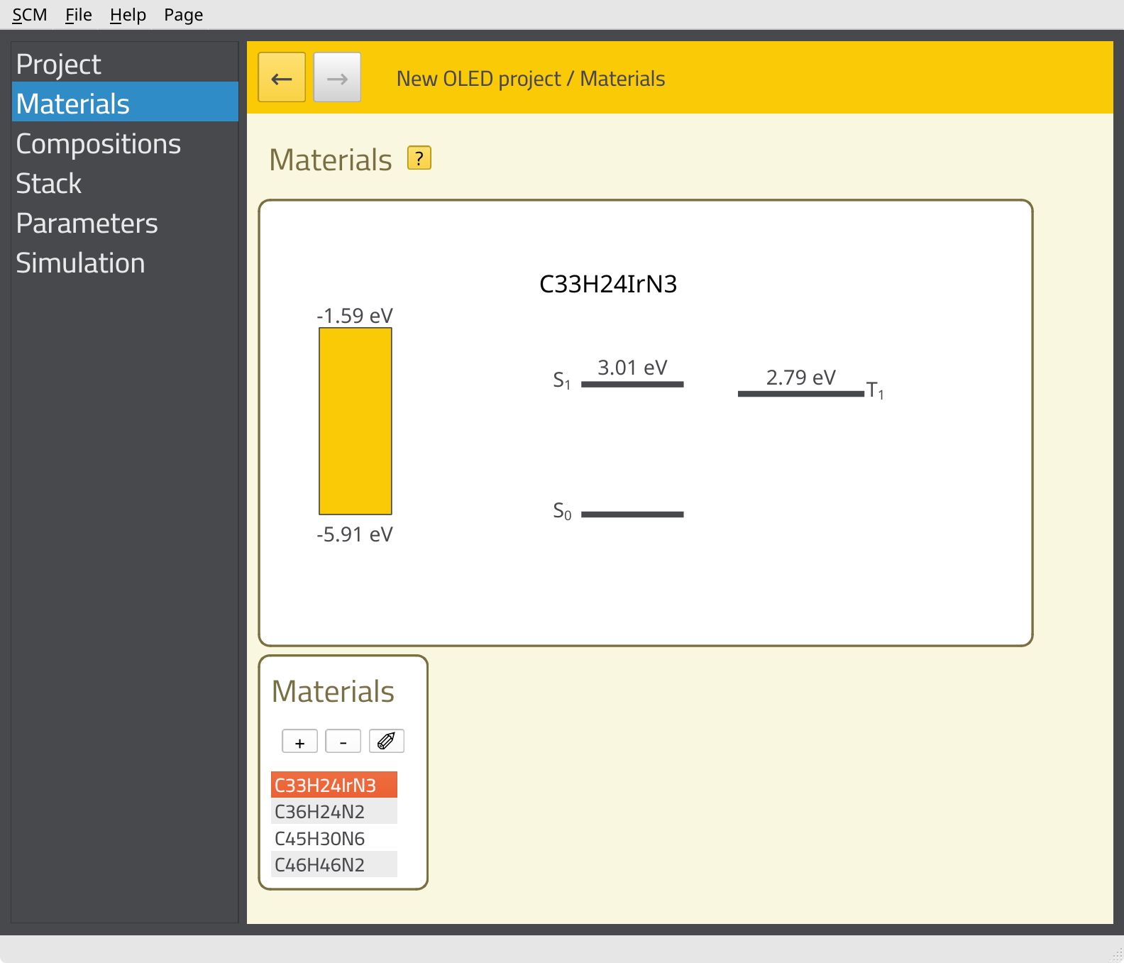 HTL by clicking the field in the Name column.EMI containing 30 nm of C33H24IrN3 + C36H24N2.ETL containing 20 nm of C45H30N6 (TPBi).The energy level diagram of the stack will be shown at the top of the page.