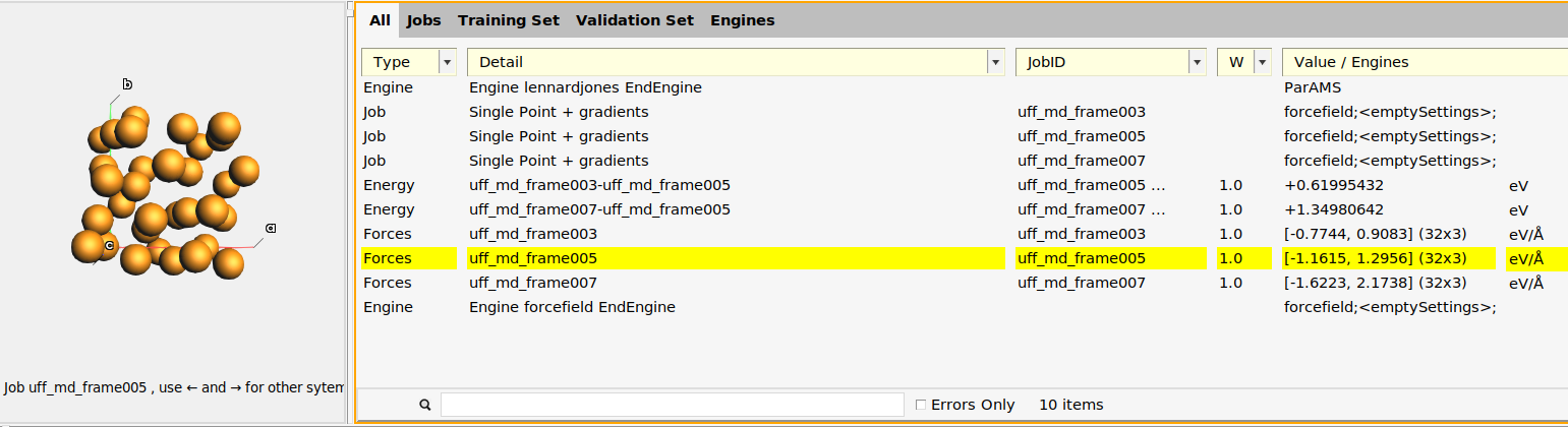 uff_md_frame003-uff_md_frame005anduff_md_frame007-uff_md_frame005, with the corresponding reference values. In this case, frame 5 had the lowest energy so the relative energies are taken relative to that frame. In your case, frame 3 or 7 may be the lowest energy frame.Three forces expressions for the three frames. If you select a force entry and switch to the Info panel in the bottom table, you can see the individual force components.