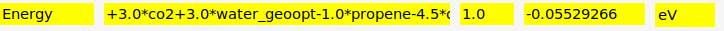 co2.energy("co2")+energy("w and press TAB multiple times. This will cycle through all jobs starting with “w”. If you followed both the Charges and forces and Bonds and angles steps, there will be two jobs water and water_geoopt.energy("co2")+energy("water_geoopt")-1.0*energy("propene")-energy("o2") (start with the products and positive signs, and end with the reactants and negative signs). Write an explicit 1.0* before energy("propene")