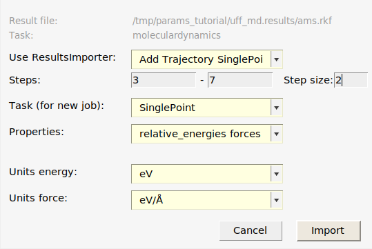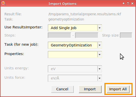 Choosing Job → Add to ParAMS (Ctrl-T) in AMSjobs or Jobs → Add Job (choosing an ams.rkf, OUTCAR, or quantum-espresso.out file) in the ParAMS GUI. This brings up a ResultsImporter dialog and is the recommended way to import a job into ParAMS. In the dialog you can directly import results like energies, forces, stress tensor, charges, bond scans, angle scans, volume scans, and any other PES scan. It is recommended to use the dialog to import those results.