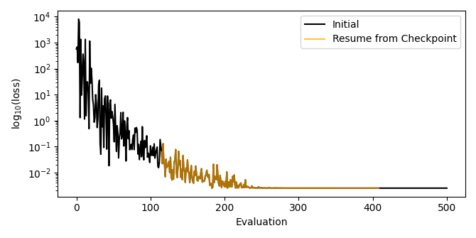 When resuming a checkpoint, results from a previous optimization will not be shown, but the evaluation numbers will be unique and continue from previous results so they can be linked.