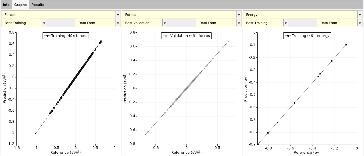 At the end of the training, you also get a scatter plot with predicted vs. reference forces and energies. You can switch between Best training and Best validation to see the training and validation performance.