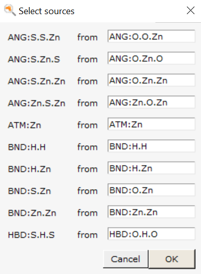 For ZnOH.ff, the asterisks in e.g. BND:Zn.O* indicate that we will instead copy those parameters to initialize the BND:Zn.S block. That is, the Zn-O interaction in ZnOH.ff will be used as first guess for the Zn-S interaction in the new force field.