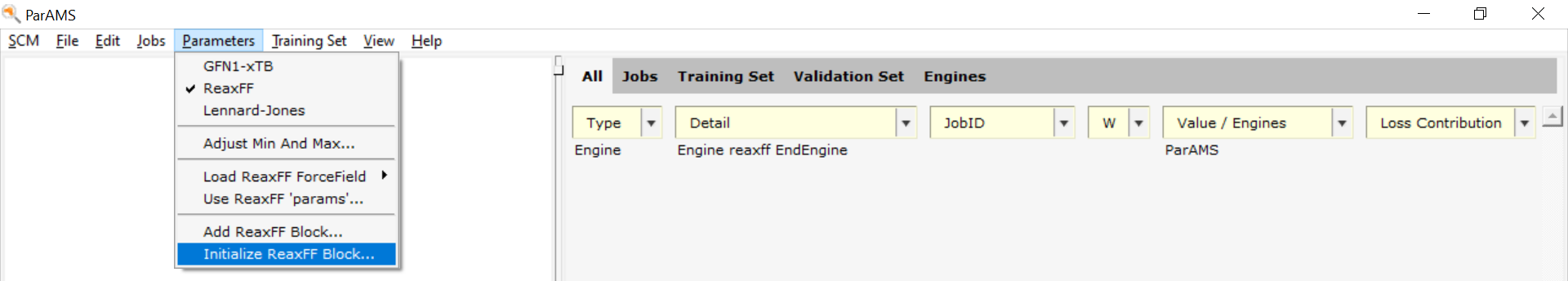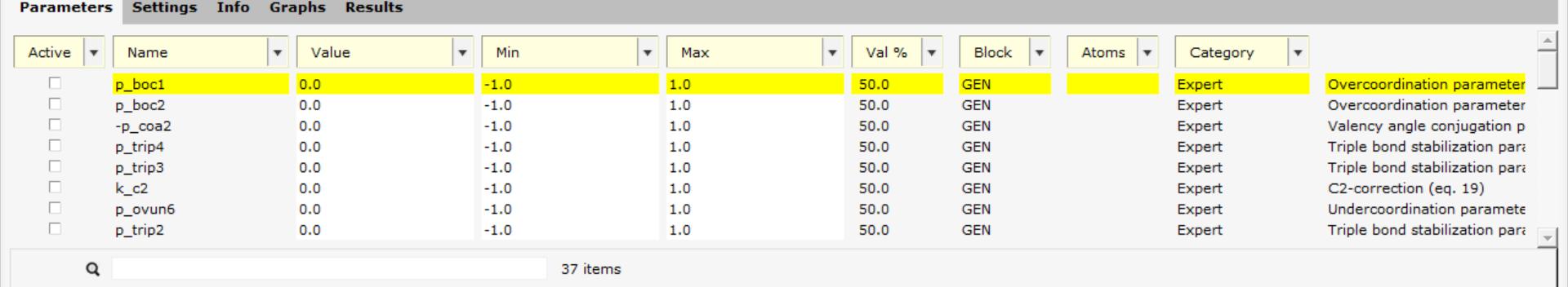 In the Parameters tab, you will see the ReaxFF parameters in the GEN block. Those parameters always exist for any ReaxFF force field.