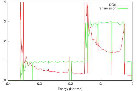 As would be expected for a 1D system, the DOS shows Van Hove singularities at the band edges. Apart from oscillations due to the finite size of the system in ADF, the transmission only reaches integer values. Between approximately -0.35 and -0.15 Hartree, only the sigma channel contributes to the transmission. Above -0.15 Hartree also the two pi channels start to contribute.