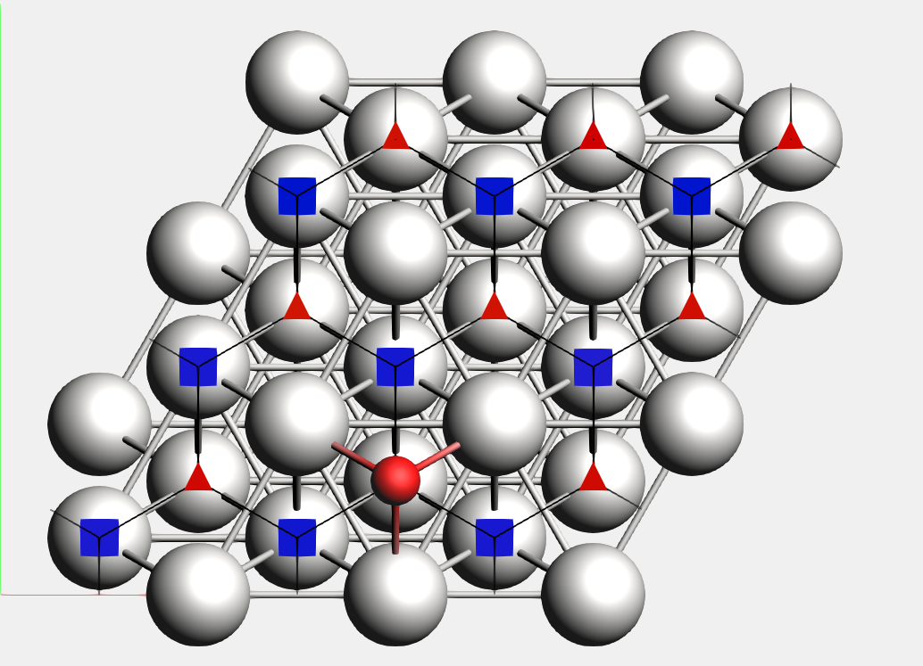 For instance, in Example: PES Exploration, Binding Sites for O on Pt 111, the platinum surface is the reference region, while the oxygen atom is the adsorbate. In the picture below, you can see the oxygen binding sites on the platinum 111 surface (the two different types of binding sites are marked by a blue square and a red triangle respectively).