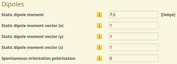 Dipole strengths are provided for each material to allow scaling of the interactions based on the composition morphology. An isotropic dipole distribution is used by default. Alternatively, biased dipole fields can be specified as part of the dipole settings of the materials.