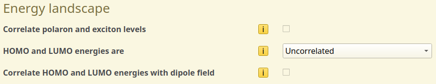 A disordered arrangement of dipoles can be generated by selecting the Correlated HOMO and LUMO energies with dipole field option in the Energy Landscape settings in the parameter set. The dipolar coupling at each gridpoint will then be evaluated to determine the spatial energy level distribution.