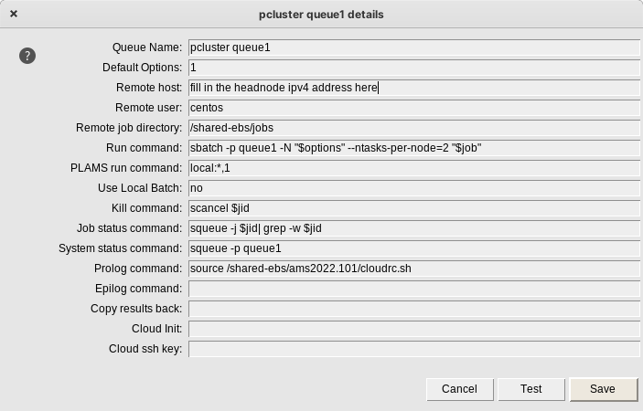 Queue name: Give the queue a name which will be used inside AMSjobs to refer to it, for instance pcluster queue1.Default options: leave it at1Remote host: Fill in the public Ipv4 address of your cluster’s Head Node. You can find this in the EC2 console. Alternatively, you can use thepcluster sshcommand to connect, as it will also tell you the hostname when you log in.Remote user: The username should beubuntufor Ubuntu systems, for other distributions it isec2-user.The
