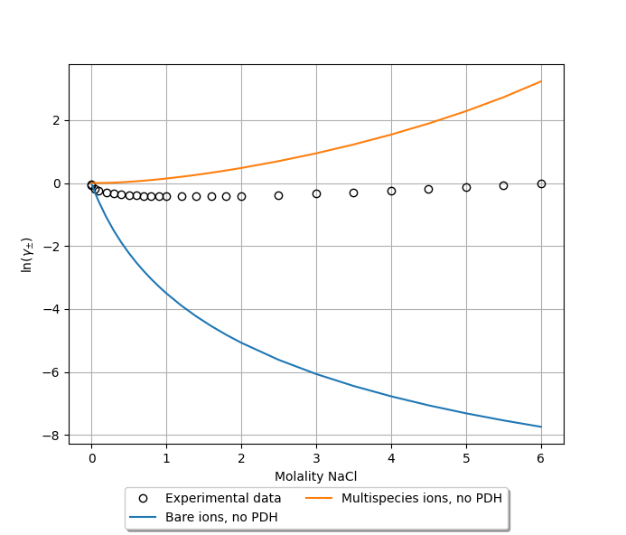 Mean ionic activity coefficients can be calculated with the exact same procedure as above. This results in a much better correspondence to experiment [2], though the results seem to show the wrong trend.