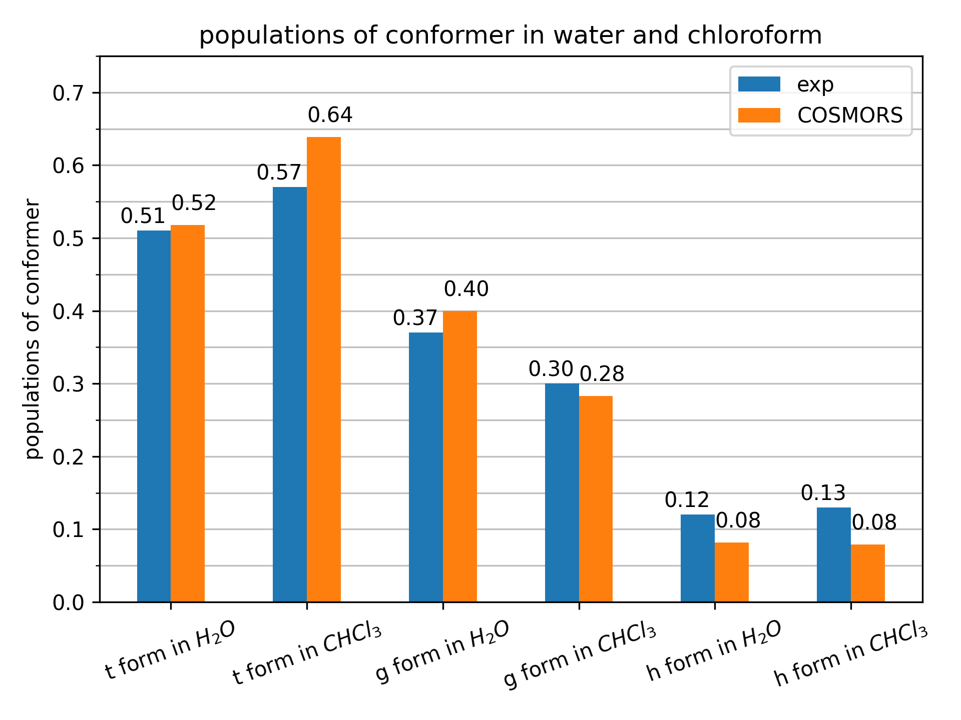 Now, we can sum up the populations of all of the 3 conformations for each of the t-form, g-form, and h-form. Comparing these results to conformer populations derived from H-NMR data [3], we observe good agreement with our predictions. This is shown in the the figure below.
