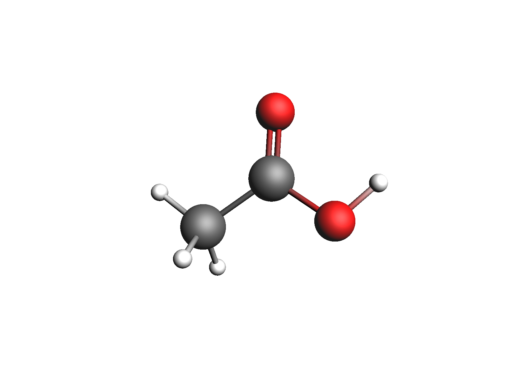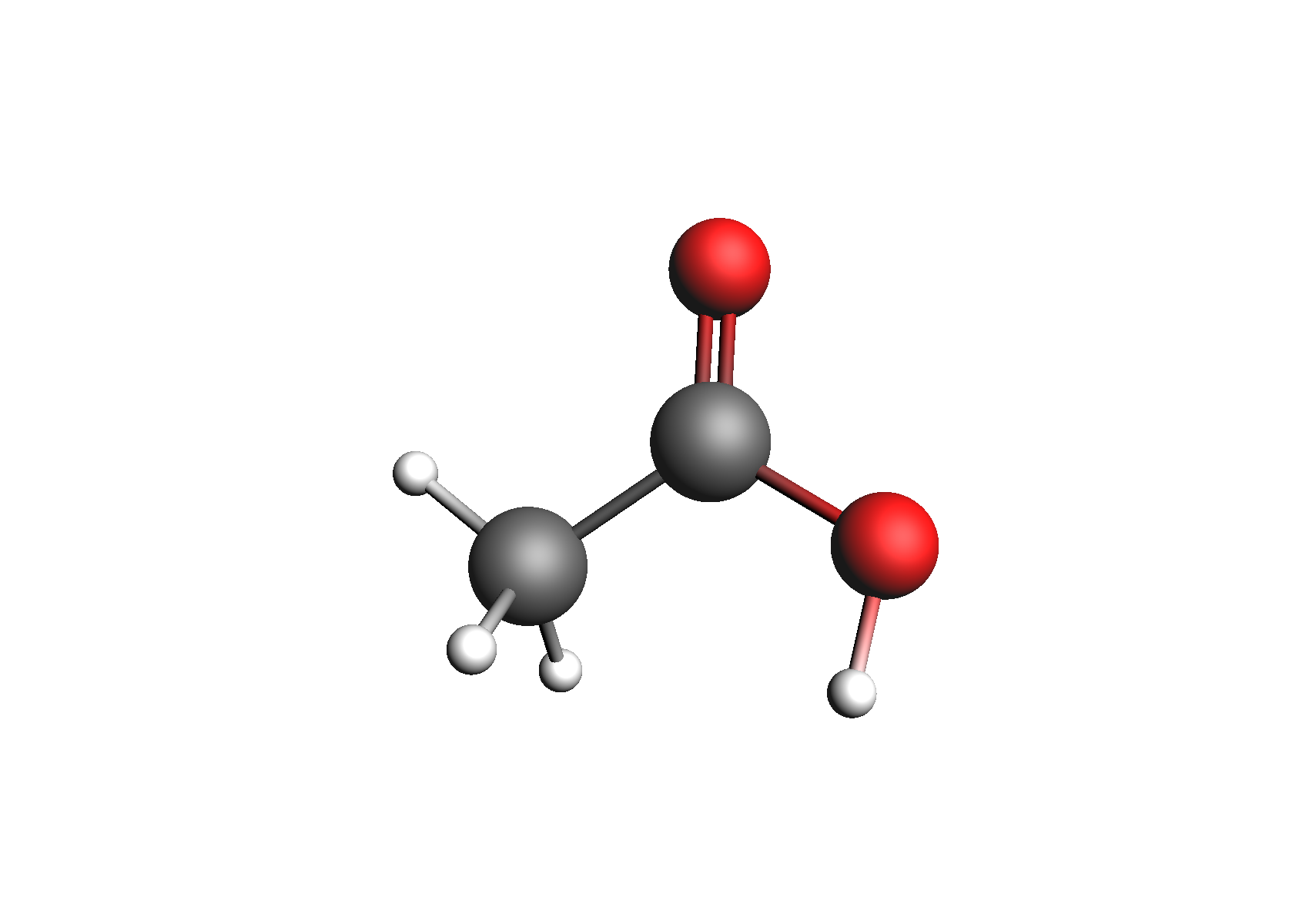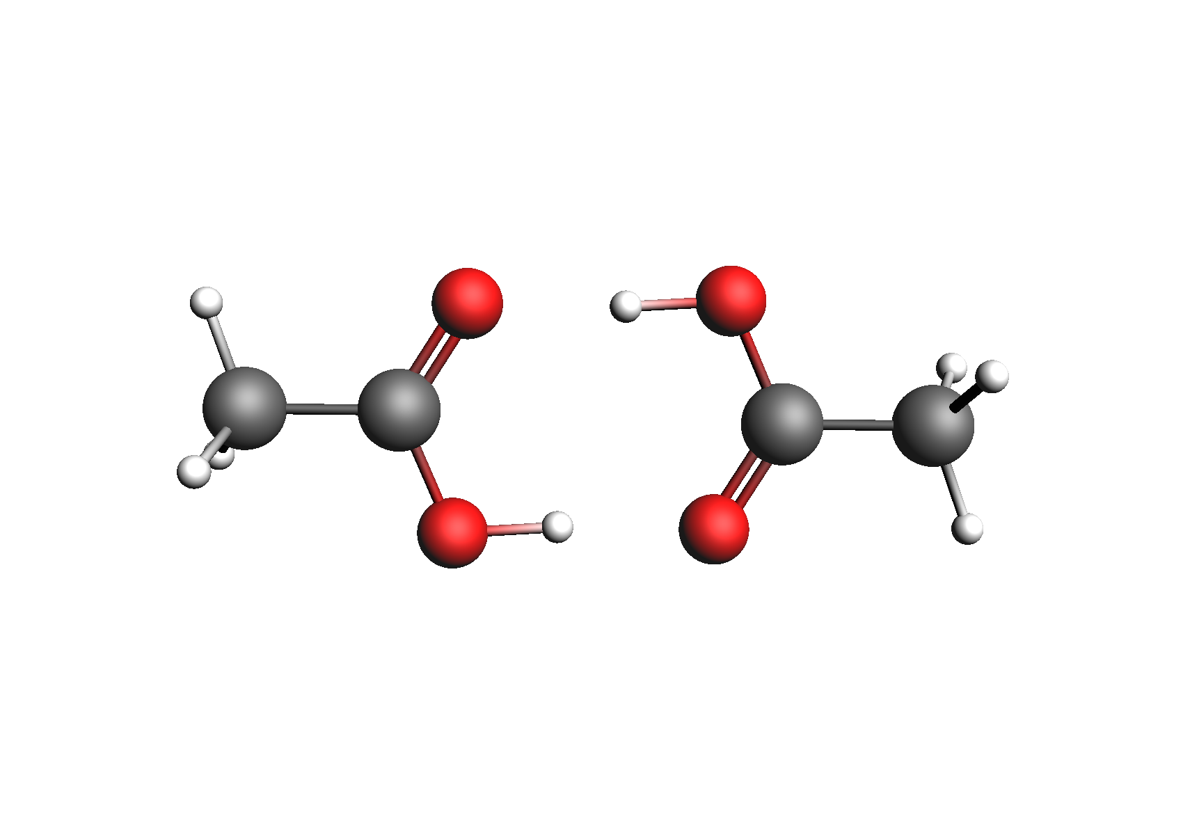 Structures used to represent acetic acid: lowest energy conformer, higher energy conformer, and dimer (clockwise from top left)