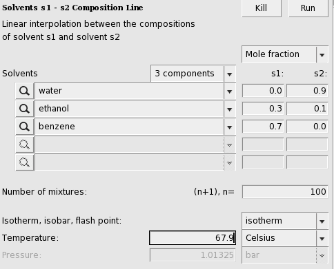 A phase diagram of a mixture of two solvents, which both could be mixtures, can be calculated with Properties → Solvents s1 - s2 Composition Line. The mixture will be calculated for a list of molar (or mass) fractions of the solvents between zero and one, and the compositions of solvent 1 and solvent 2 are linearly interpolated. This can be done at constant temperature (isothermal) or at constant vapor pressure (isobaric).