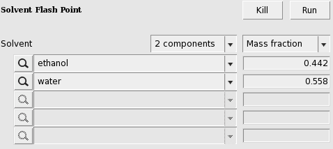 Here we mix equal volumes of water (assuming a density of 0.997 kg/L) and ethanol (assuming a density 0.789 kg/L). For a flash point calculation, the pure compound flash points are needed as input, since COSMO-RS does not predict pure compound flash points. The AMS COSMO-RS module uses Le Chatelier’s mixing rule to calculate the flash point of a mixture.