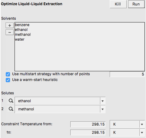 In this step a mixture of immiscible solvents is optimized in order to maximize or minimize the distribution ratio (D) of two solutes between the two liquid phases. A list of pure solvents should be provided. At least two of these solvent should be immiscible with each other. In this example we try to optimize the mixture of immiscible solvents for liquid-liquid extraction (LLE) of methanol and ethanol.