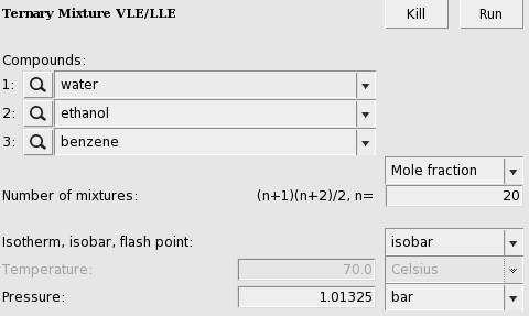 A phase diagram of a mixture of three components can be calculated with Properties → Ternary Mixture VLE/LLE. The ternary mixture plot will be calculated by iterating over possible values of molar (or mass) fractions for each of the compounds. This can be done at constant temperature (isothermal) or at constant vapor pressure (isobaric).