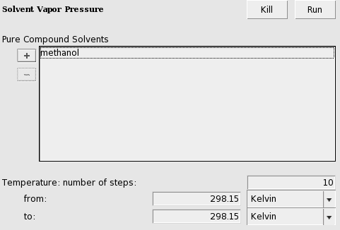 The vapor pressure of a solvent at different temperatures can be calculated with Properties → Vapor Pressure Pure Solvents or Properties → Vapor Pressure Mixture.