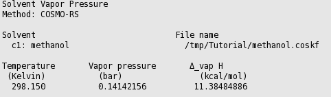 In this case COSMO-RS predicts a vapor pressure of about 0.61 bar (around 455 Torr) at 323.15 K (50.0 °C) for the pure liquid methanol.