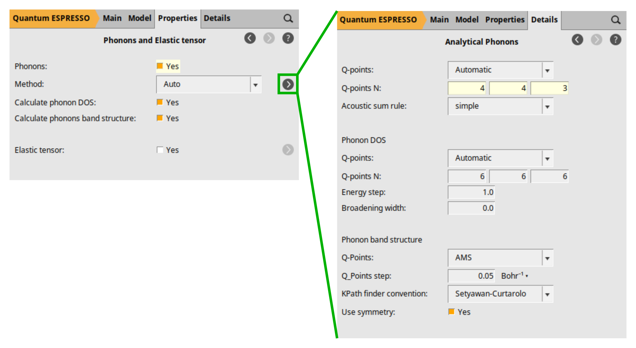 Now, use the panel bar Properties → Phonons and Elastic Tensor command to go to the Phonons (and Elastic Tensor) configuration panel. Then: