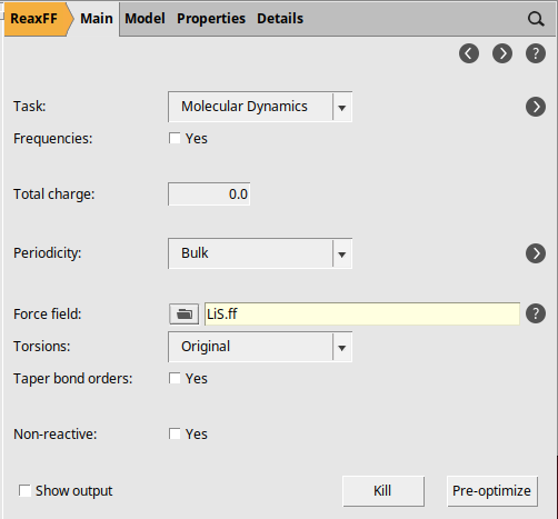Remark: if you did not create the amorphous structure yourself, but instead used the (already-relaxed) amorphous structure from the downloaded .xyz file, then first you may need to start AMSinput, select ReaxFF, and select the LiS.ff force field, and in one of the next steps you may need to add a new thermostat.