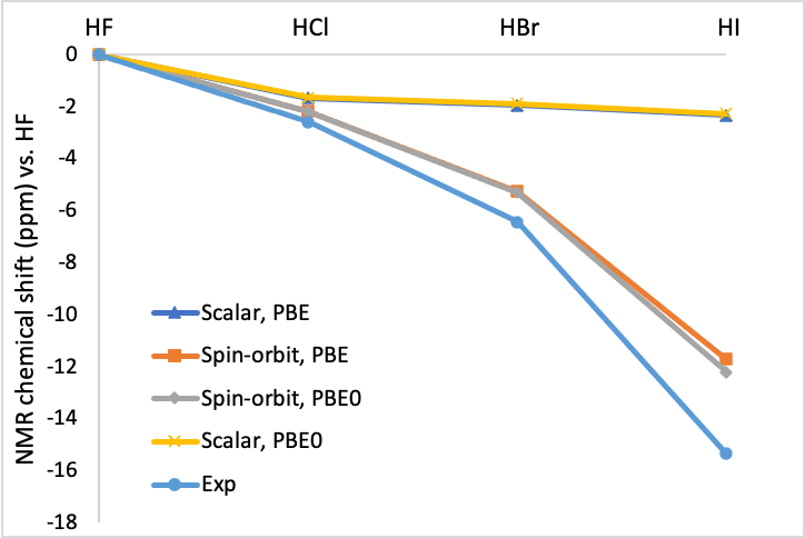 Scalar relativity and spin-orbit coupling can have a large effect on the calculated NMR parameters, especially for heavy atoms. Relativistic effects can also be significant for a light element that is close to a heavy atom. This tutorial addresses how the NMR chemical shift of 1H in the hydrogen halides series (HF, HCl, HBr, HI) is affected by spin-orbit coupling. For more information on how relativity effects the calculation of NMR parameters, see Jochen Autschbach‘s chapter on ‘Relativistic Effects on NMR Parameters’ in High Resolution NMR Spectroscopy edited by Rubén Contreras.