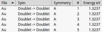 Remark: All systems calculated in the Tutorial contain some symmetry. These symmetries may have multi-dimensional irreps, in which case one can expect degeneracies in the excited state energies. In the ROKS-TDA-SOC implementation in ADF, however, symmetry can not be used. To preserve degeneracy also in calculations in which no symmetry is used it is required that all subspecies of an irrep for a given excited state are calculated (included). This means that one should choose the number of wanted excitations wisely (which is done is this Tutorial). One may have to iterate over the number of wanted excited states, if one does not observe the expected degeneracies. One may also first do ROKS-TDA calculations, thus without perturbative SOC, in which one can use higher symmetries. Note that numerical issues may also lift degeneracies. The symmetry labels labels are not deduced here, but are taken over from Refs. [1] [2].