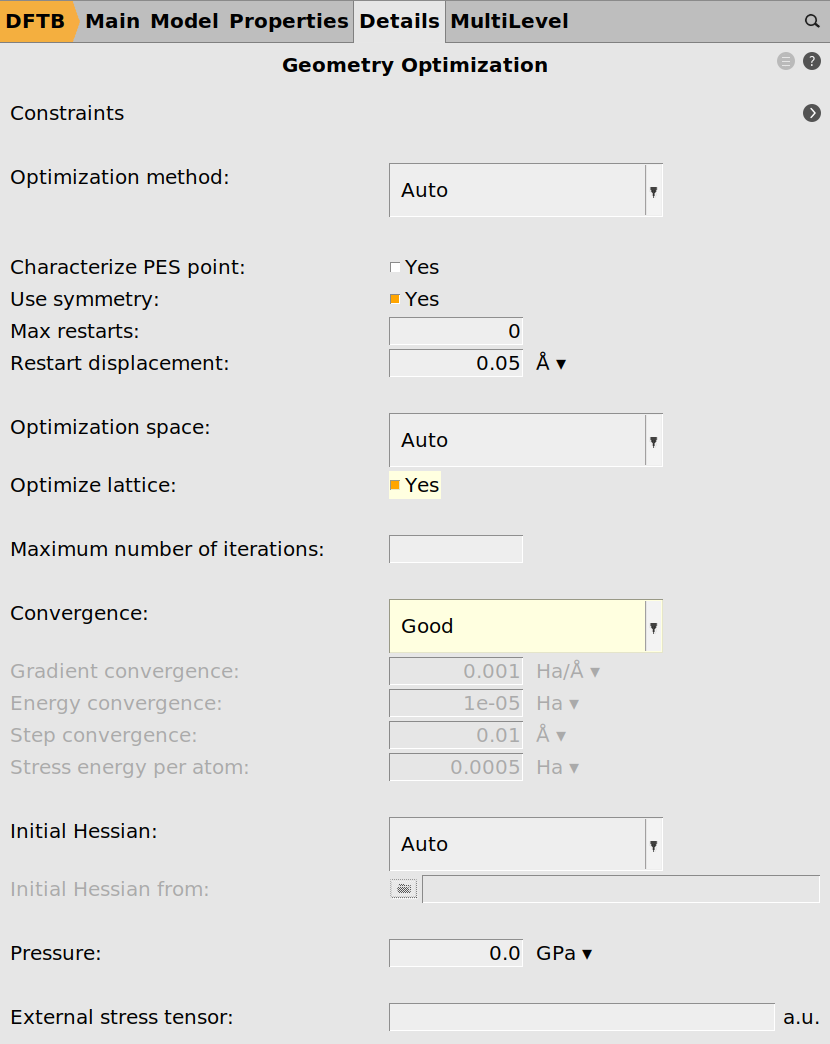 The convergence criteria used for the initial optimization in this tutorial match those used for the calculation of the elastic tensor, see the manual entry for further information. This is done by setting the Convergence quality to Good (corresponding to 10 times smaller thresholds), which should be considered the minimal quality that gives reliable results.