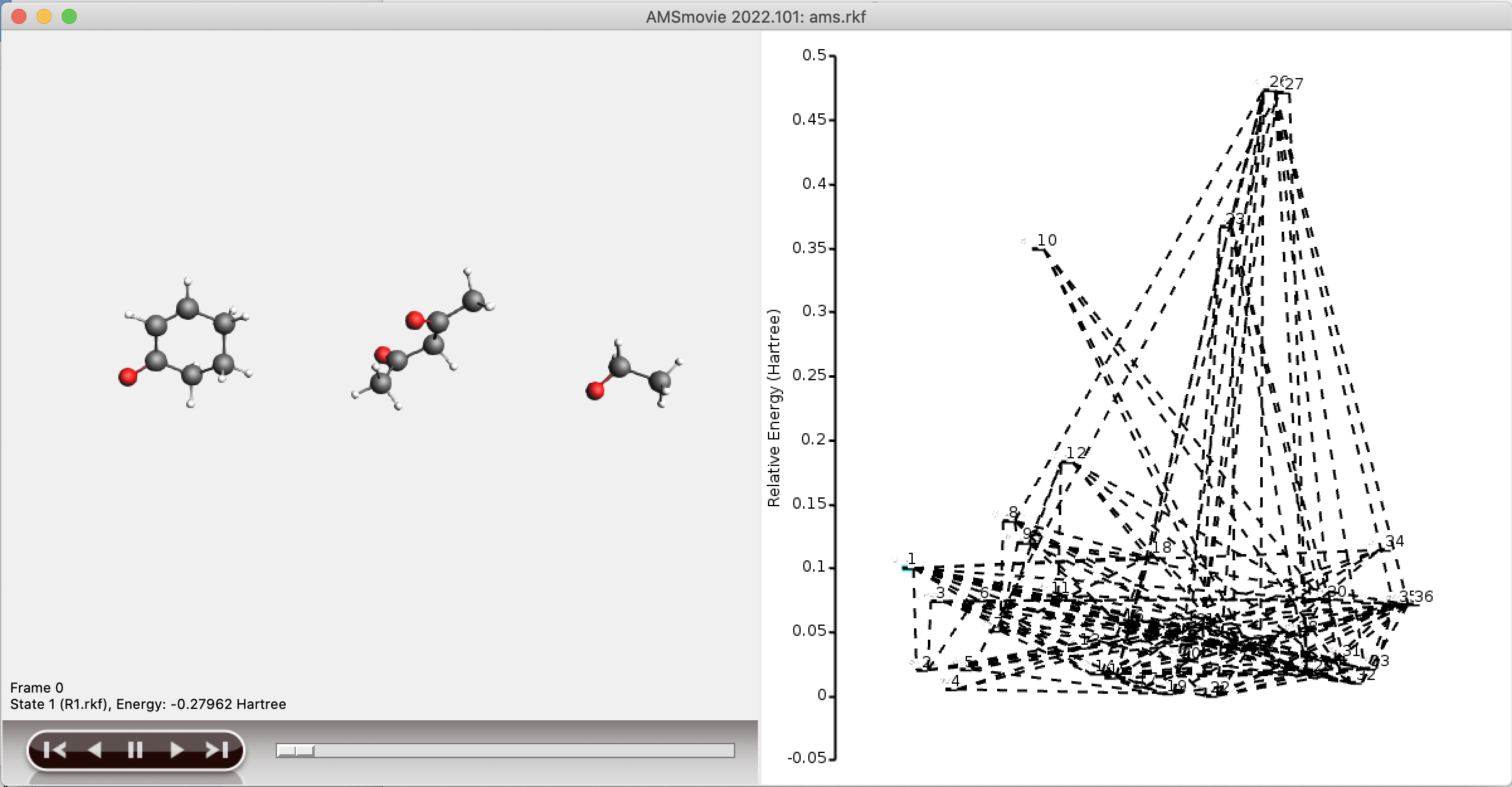 Since the full reaction network is often too large to conveniently visualize, a separate network is stored containing only the shortest paths from reactant to product. This subnetwork is stored in the folder plams_workdir/acerxn/shortest_paths. Generally, viewing the shortest paths in AMSMovie should yield a good overview of the structures involved in, and the potential energy profile of, the shortest paths.