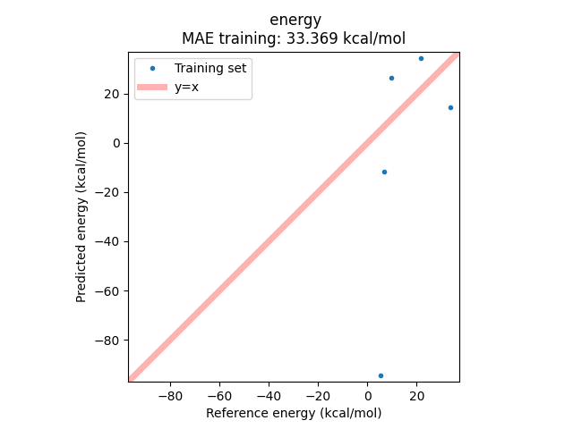 and the scatter plot of predicted vs. reference energies: