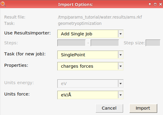 Choosing Job → Add to ParAMS (Ctrl-T) in AMSjobs or Jobs → Add Job (choosing an ams.rkf, OUTCAR, or quantum-espresso.out file) in the ParAMS GUI. This brings up a ResultsImporter dialog and is the recommended way to import a job into ParAMS. In the dialog you can directly import results like energies, forces, stress tensor, charges, bond scans, angle scans, volume scans, and any other PES scan. It is recommended to use the dialog to import those results.