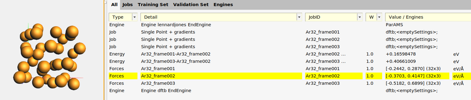 Ar32_frame001-Ar32_frame002andAr32_frame003-Ar32_frame002, with the corresponding reference values. In this case, frame 2 had the lowest energy so the relative energies are taken relative to that frame. In your case, frame 1 or 3 may be the lowest energy frame.Three forces expressions for the three frames. If you select a force entry and switch to the Info panel in the bottom table, you can see the individual force components.