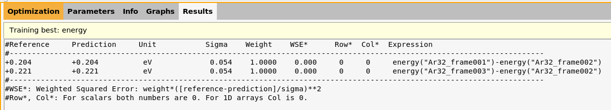 Further down in the file are the energies. In the row energy the N is 2 (the total number of energy entries in the training set). The entry Ar32_frame003-Ar32_frame002 has N = 1, since the energy is just a single number. In that case, the MAE and RMSE would be identical, so the file gives the absolute error in the MAE column and the signed error (reference - prediction) in the RMSE column.