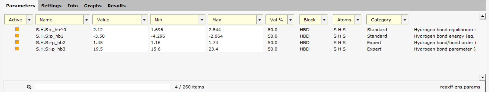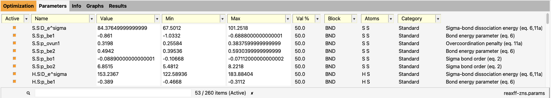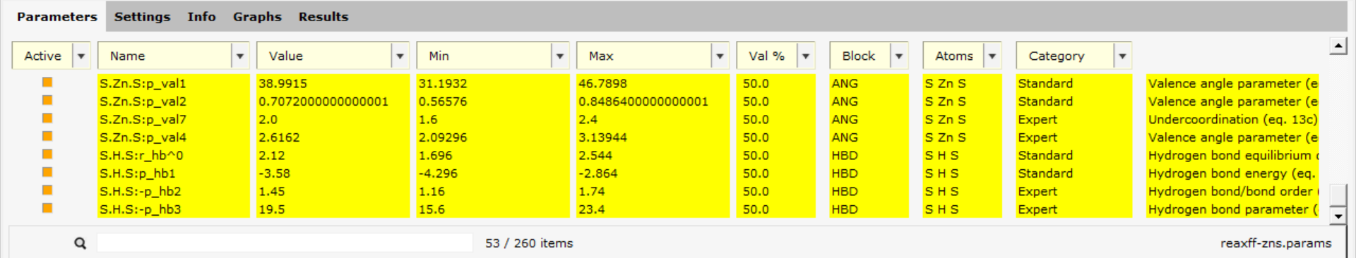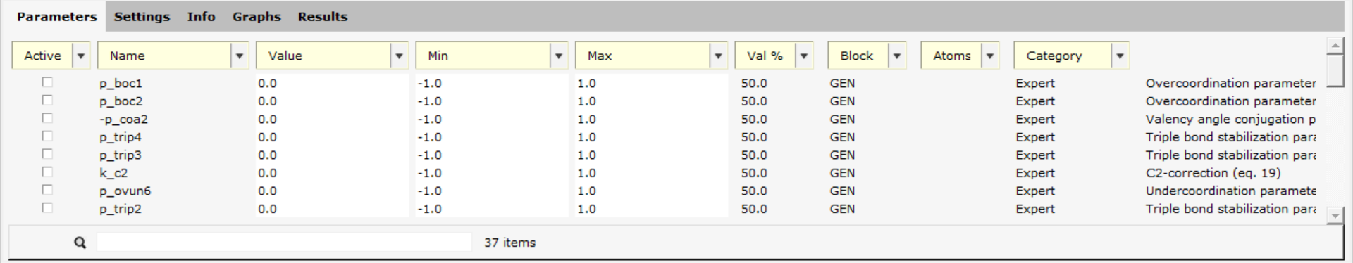 In the Parameters tab, you will see the ReaxFF parameters in the GEN block. Those parameters always exist for any ReaxFF force field.
