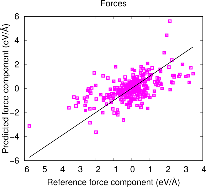 Fig. 3.2 Reference and predicted forces on the two depicted structures. The structures were obtained by geometry-optimizing a slab using a previous iteration of the force field.¶