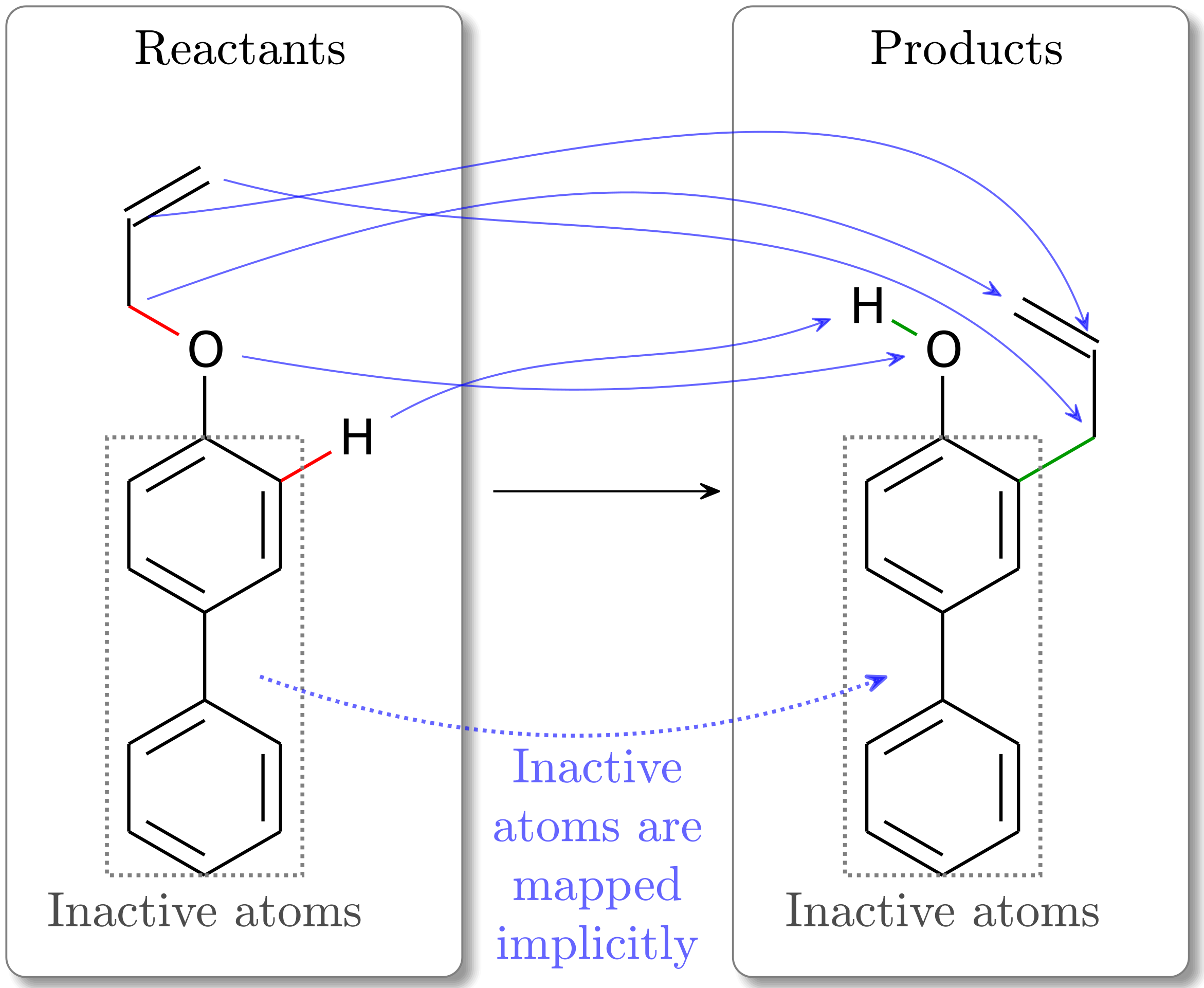 Fig. 2 In this Claisen rearrangement mapping, we see the inactive atoms (in the gray dashed boxes) in the reactants are mapped directly to the identical index in the products. The active atoms, however, can be mapped to a differently indexed product atom, which is observed to happen in this example.¶