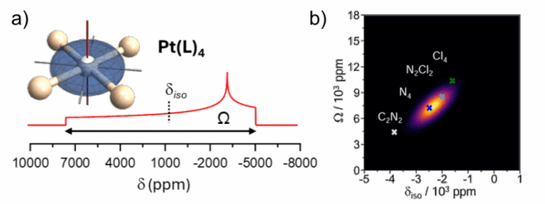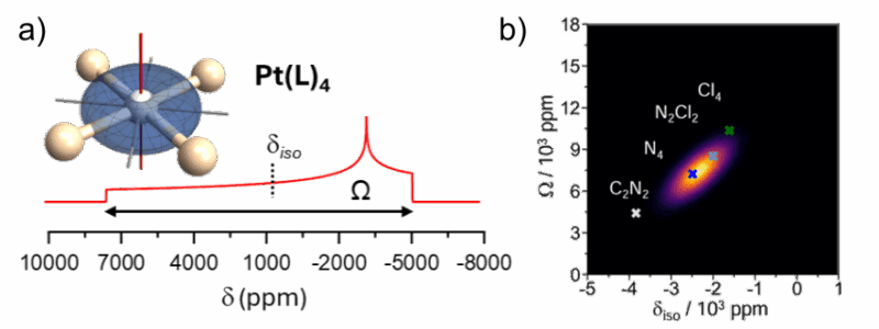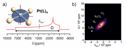 In a recent article published in Nature, the authors used 195Pt solid-state NMR parameters (isotropic chemical shift, δiso, and span, Ω; Figure 1a) to elucidate the nature of coordination environments in Pt Single-Atom Catalysts (SACs). This study highlights how the metal solid-state NMR signature encodes information on the distribution of coordination environments in SACs and showcases how extracting NMR parameters can be used to monitor the influence of the synthetic approaches on the metal sites environment, for instance to study how reproducible a synthetic protocol is, or how host materials influence Pt site structures. This methodology also enables monitoring the evolution of Pt environments during catalysis.