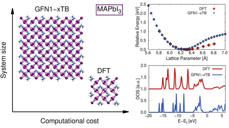 The fundamental understanding of the material properties of metal halide perovskites is critical to improving the stability and efficiency of future solar cells devices. Computational simulations have been proven to be a valuable tool to describe the physicochemical properties of metal halide perovskites at the atomistic level. For a thorough understanding of these complex systems, the simultaneous modeling of electrons and ions in relatively large systems is required, which is computationally very demanding with DFT methods. Researchers from Eindhoven University of Technology (TU/e) have benchmarked the suitability of the recent GFN1-xTB density functional tight-binding method for simulating halide perovskites properties.