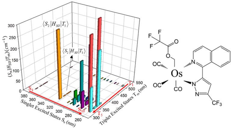The Os(fipz)(tfa)(CO)3 (tfa = trifluoroacetate, fipz=3-trifluoromethyl-5-(1-isoquinolinyl)-1,2-pyrazole) complex shows excitation-dependent emission quantum yield. The higher-energy excitation (< 340 nm) contributes more to phosphorescence than fluorescence, implying stronger intersystem crossing (ISC) for highly excited singlet states. Theoretical calculations confirm that the spin-orbit coupling (SOC) integrals between the lowest singlet excited state, S1, and the low-lying triplet excited states Tn (n=1-10), are negligibly small, whereas the higher singlet states show much stronger SOC with triplet excited states.