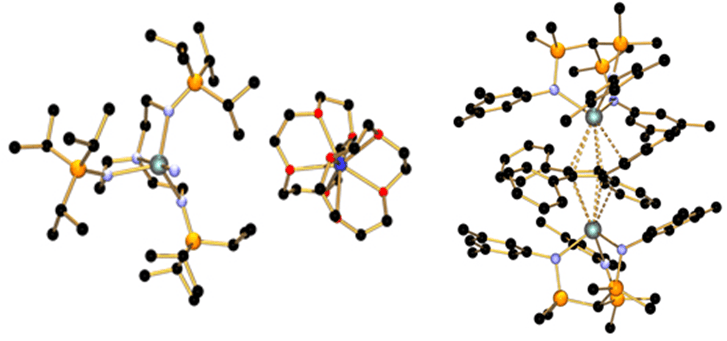 First U(V)-N triple bond (left), later oxidized to the first U(VI)-N triple bond. First U-cyclobutadienyl complex (right).