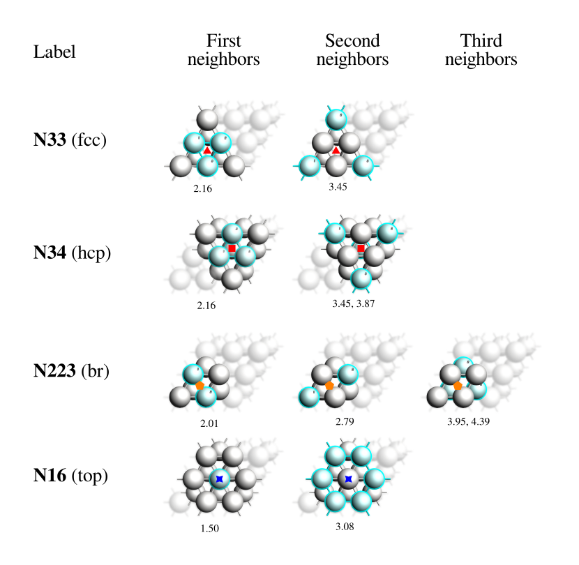 The figure below depicts the four types of binding sites observed on a Pt(111) surface. There, you can see the AMS label (e.g., N33, N34, …) as well as the traditional one (e.g., fcc, hcp, …). The distances between the binding site and the highlighted atoms on that coordination shell (or neighborhood) are listed below each geometry. If two numbers are listed, it is because two different distances are involved, but they are considered in the same coordination shell because their difference is less than PESExploration%BindingSites%DistanceDifference.