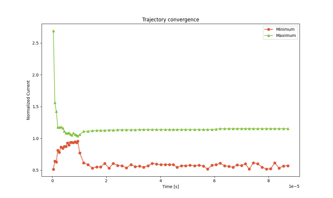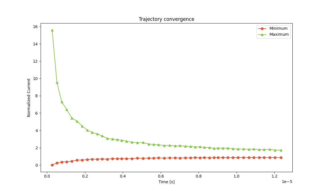 At the start of the simulation, the device current (Trajectory → Convergence → Overview → Trajectory Convergence) will behave as usual.
