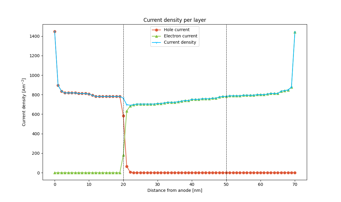 When the voltage ramp is applied, charges are gradually accelerated towards the center of the emissive layer. This results in a faster approach towards the steady-state device current compared to a constant-bias simulation.