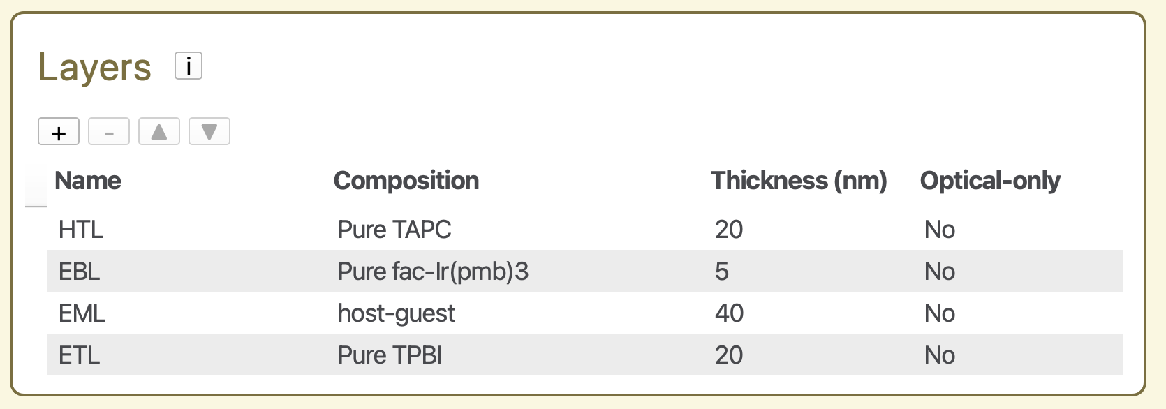 On the ‘Stack’ page, add the different OLED layers to the device.