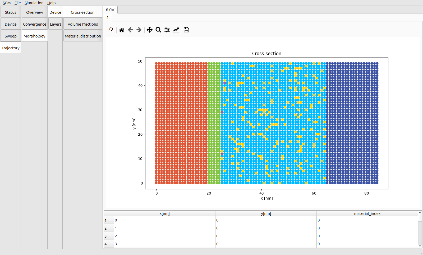 The Trajectory → Morphology → Device → Cross-section view can also be used to visualize the exact distribution of materials inside the stack.