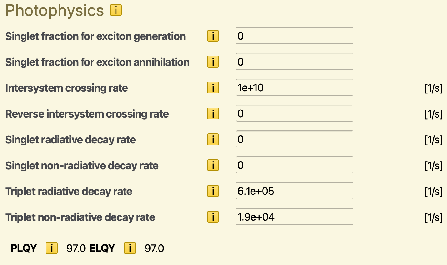 Fig. 38 Förster prefactors, intersystem crossing frequencies and singlet-triplet distributions. The PLQY and ELQY are reported automatically based on the provided rates¶