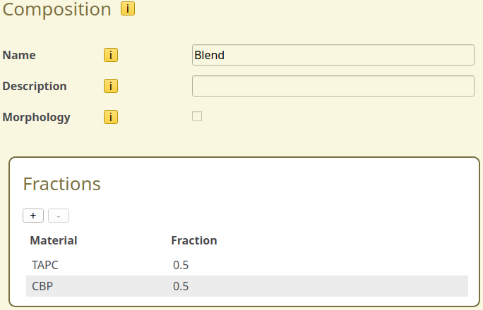 button to add 2 materials to the Fractions table. The first material will be set to TAPC, the second material will be CBP. We use a fraction of 0.5 for both materials and use the Save composition button to add the composition to the project.