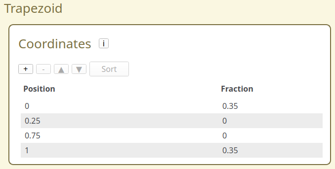 If the list of coordinates does not include the edges of the layer (\(x=0,\,x=1\)), all fractions outside the trapezoid range will be set to 0. This can also be seen in the morphology preview at the top of the page.