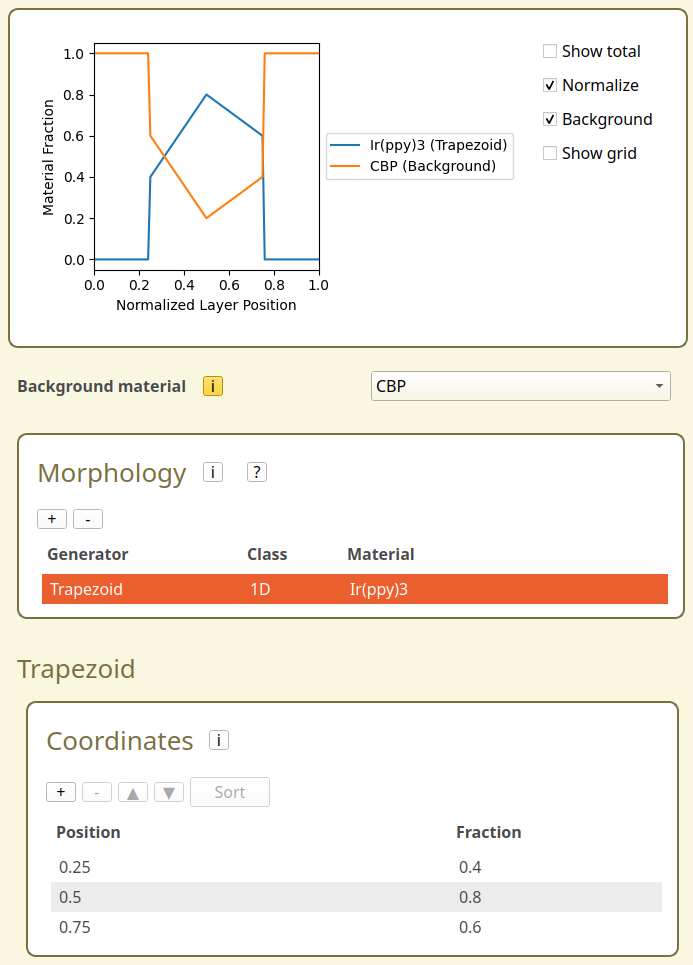 The trapezoid generator can be used to combine multiple linear interpolations. In order to create a trapezoidal gradient, the material fraction can be specified at various locations inside the layer. Linear interpolation is used to determine the fractions at the remaining gridpoints. The locations are specified as a fraction of the layer width. This allows the morphology to be used with different stacks. At each location, we will set the fraction of Ir(ppy)3.