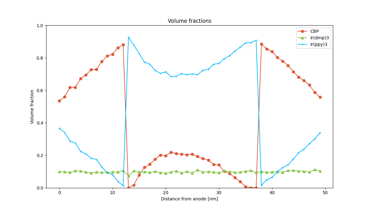 CBP is used as the host material and is therefore set as the background material. We will use a Linear generator to create a static Ir(dmp)3 fraction of 0.1. The Trapezoid is used to add an Ir(ppy)3 gradient at the edges. The Exponential gradient is used to add a dense Ir(ppy)3 region to the center of the layer.