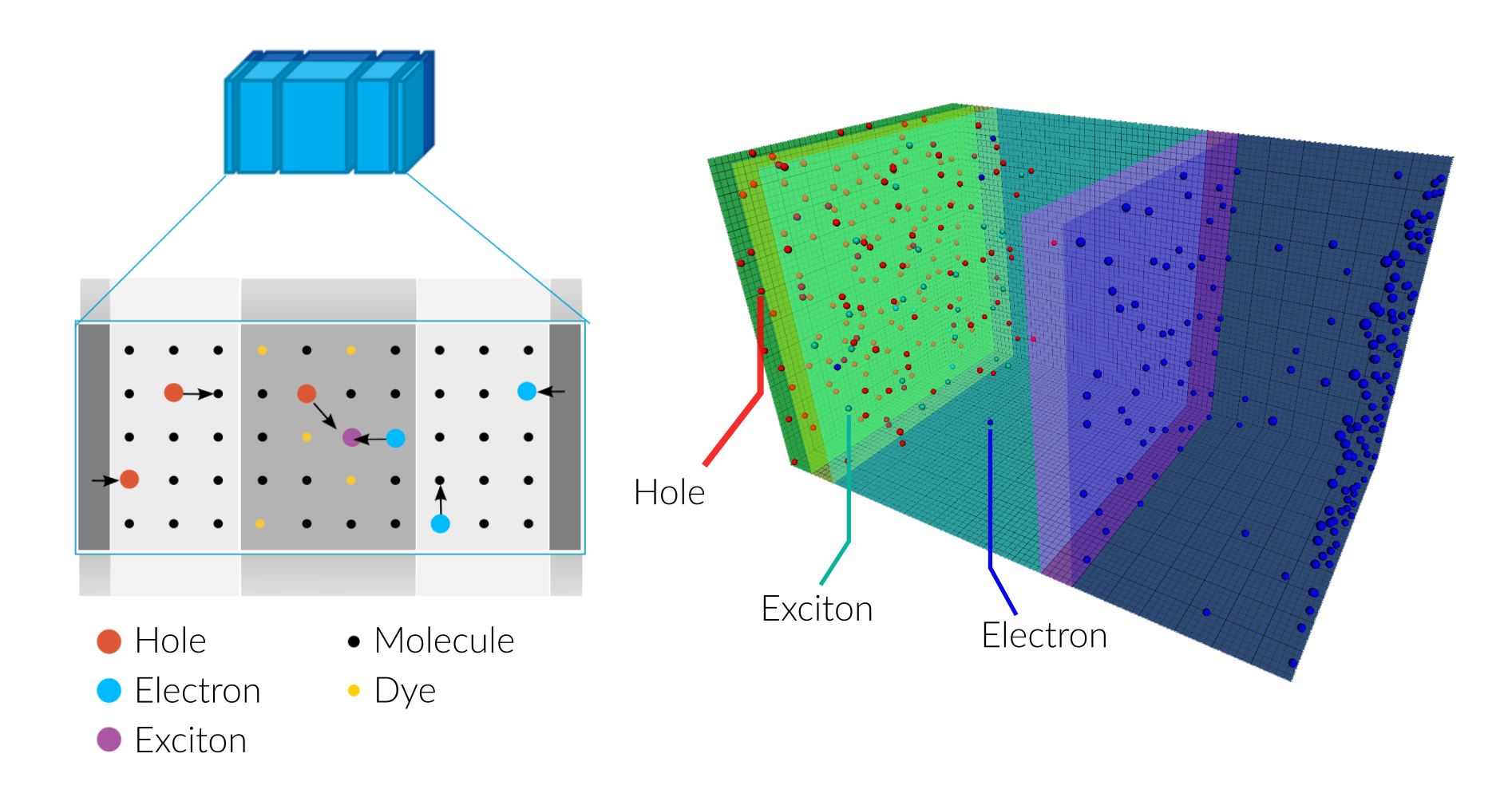 Bumblebee utilizes kinetic Monte Carlo simulations to model the opto-electronic properties of OLED stacks. The transport of the electrons through the device is described stochastically in order to determine the time-evolution and space-dependence of excitonic processes.